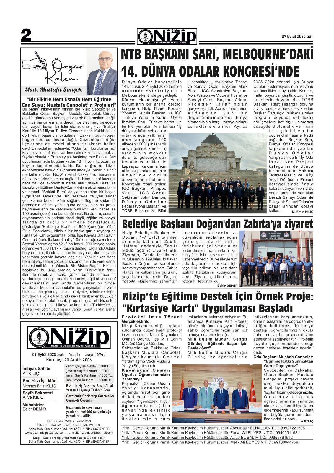 Ntb Başkanı Sarı İso Listesine Giren Firmaları Tebrik Etti